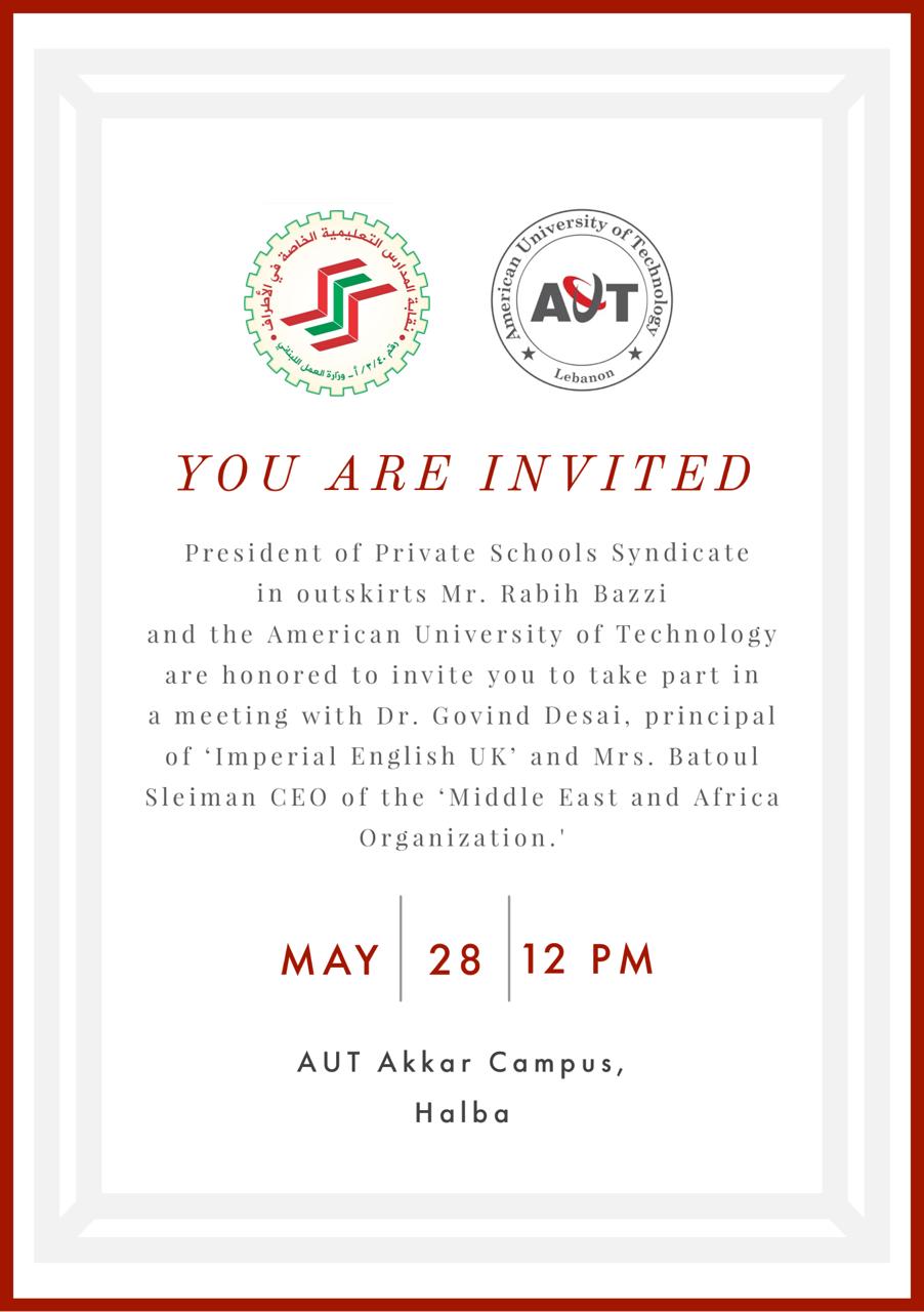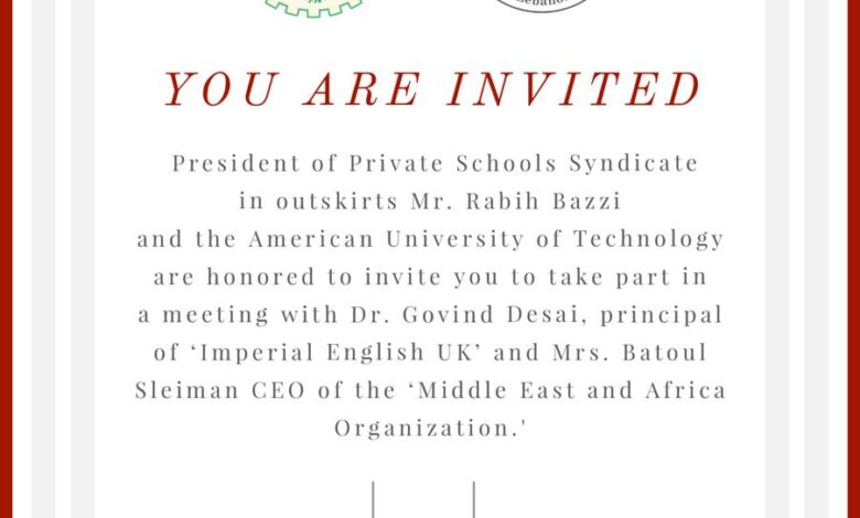 You are all invited to meet Dr.Govind Desai principal of “Imperial English U.K”and Batoul sleiman CEO of the” Middle East and Africa Organization”.